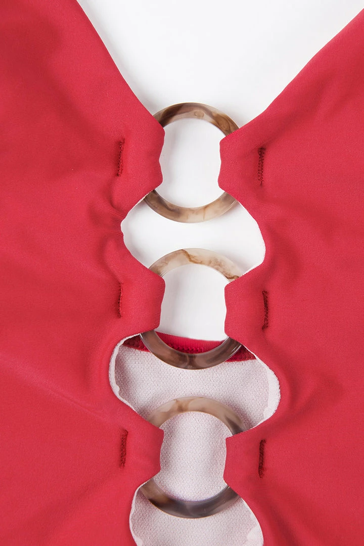 A charming hatler one piece fashioned with polished O-rings and flirty keyhole cutouts.