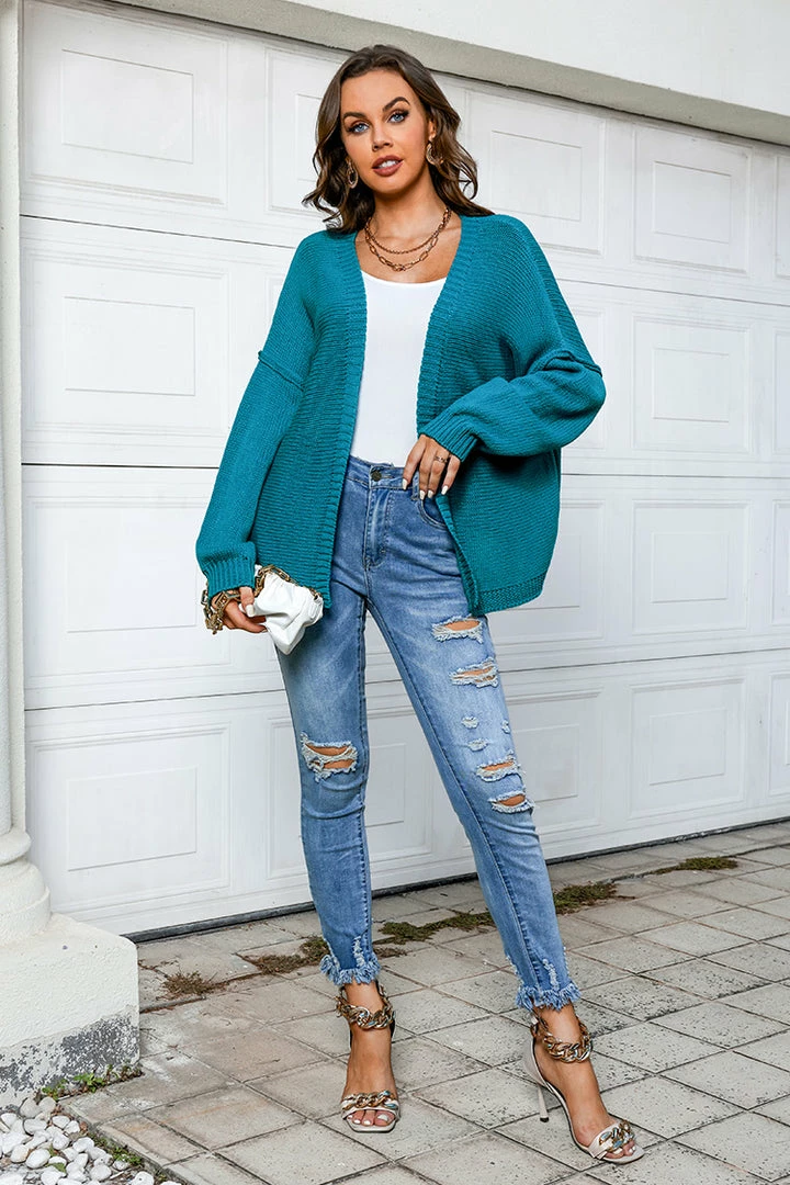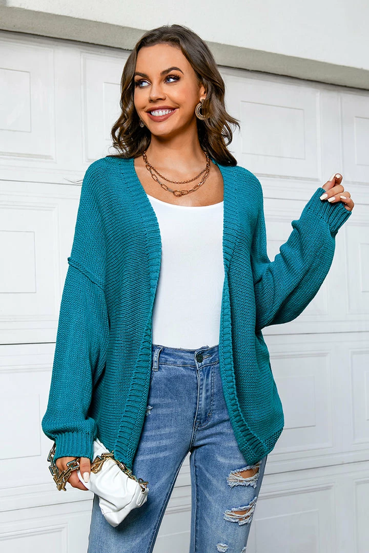 Layer up on chilly days in this knit cardigan featuring an open front, inverted seam detailing, dropped long sleeves, and ribbed trim.