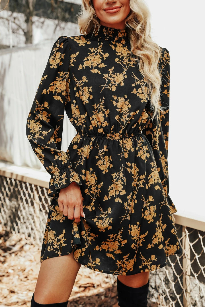 We are getting major boho vibes from this woven mini dress featuring a floral print, smocked mock neck, elasticized waist, long trumpet sleeves, and an A-line silhouette.ย