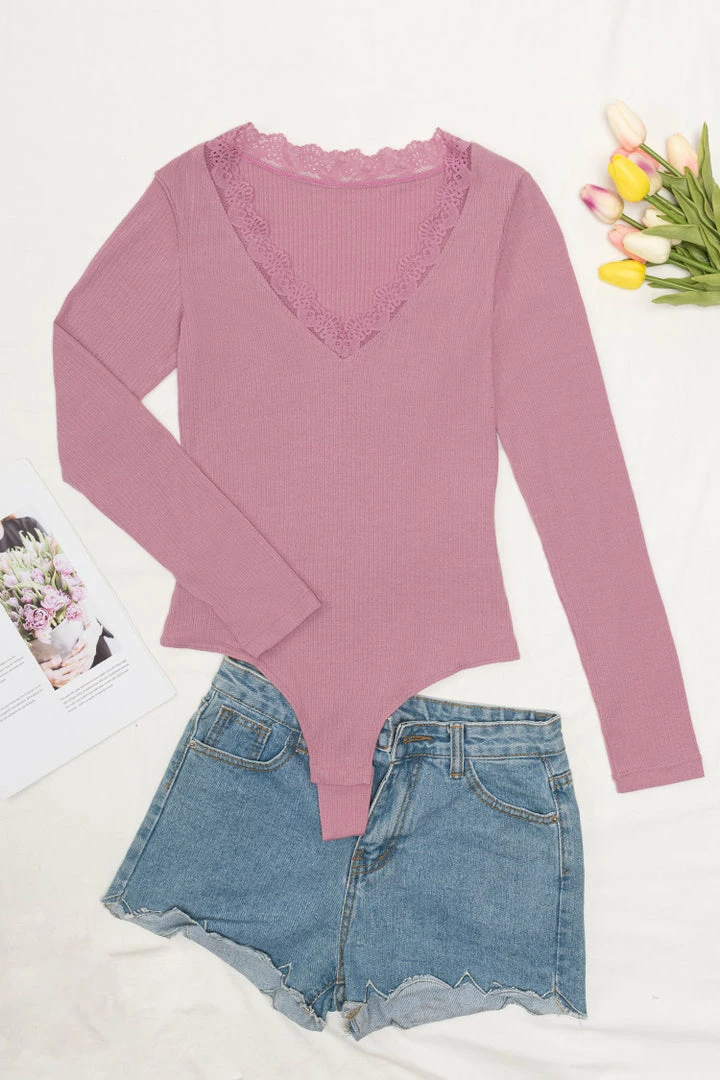 Create an off-duty look we are loving with our Leann Rib Lace Trim Long Sleeve Bodysuit. Featuring a simple scalloped lace neckline with long sleeves. The simple style can be teamed with anything and dressed up or down.