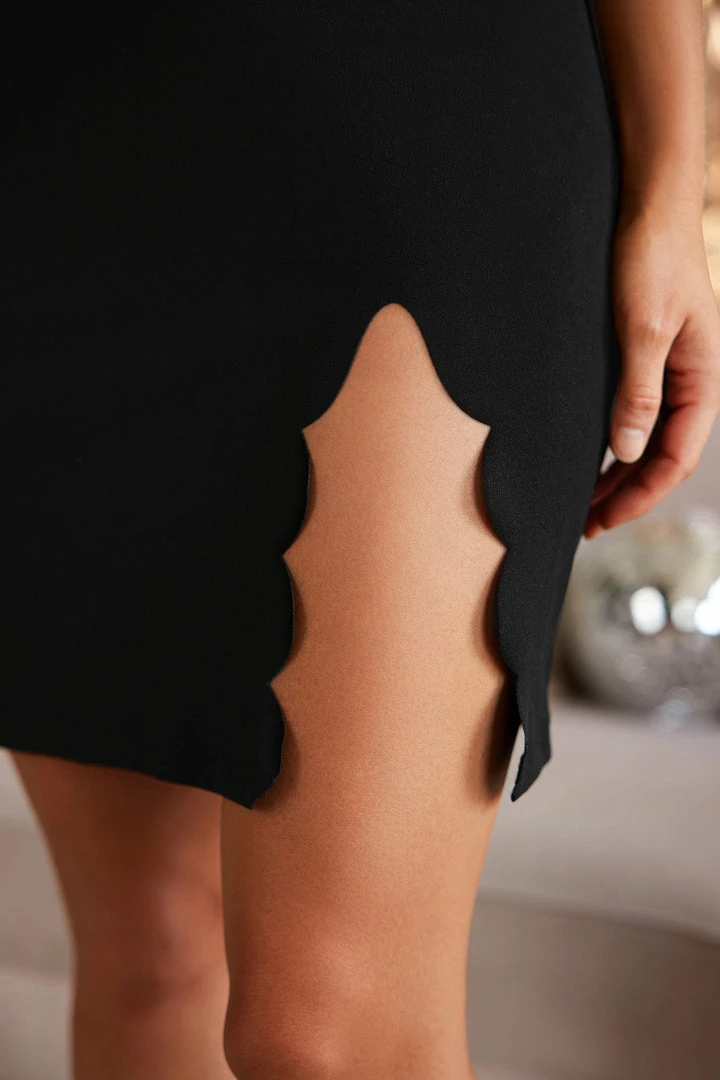 It’s impossible not to shine in this elegant and sexy little black dress featuring a V-neckline, leg slit, bodycon silhouette, and scalloped trim. Β