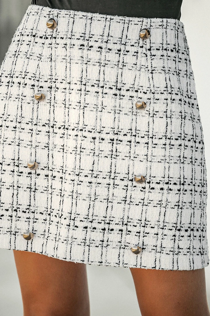 Add a sophisticated touch to your fall look with this tweed mini skirt featuring a plaid pattern, high-rise waist, front mock double-breasted front, and an A-line silhouette.