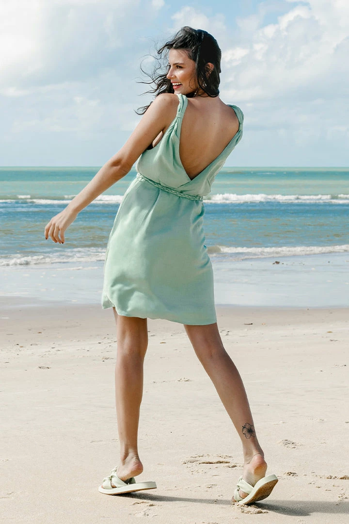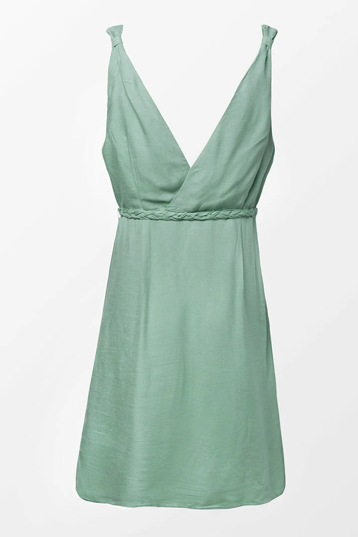 Brighten your warm weather edits with our Marianna Green Braided Belt Dress. Features a braided belt to define your waist. The straps knot at each shoulder give an eye-catching look.