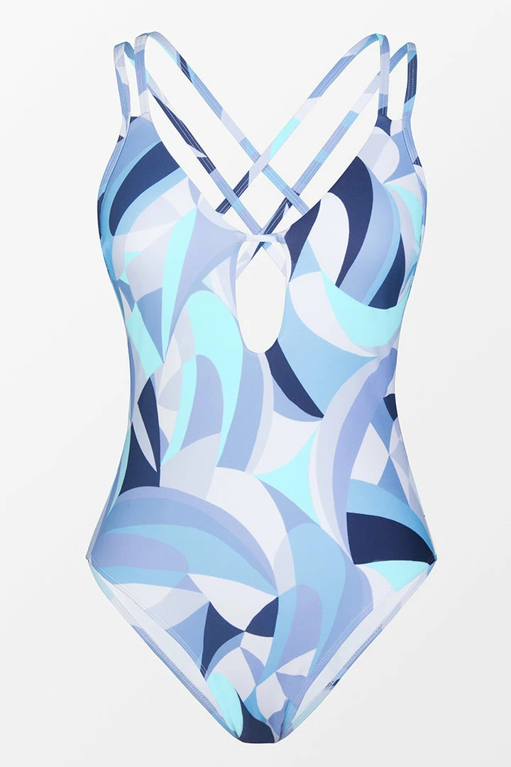 Take a refreshing dip in this strappy one piece swimsuit styled with a peekaboo keyhole and fully adjustable double straps. The geo print adds more dimension and style to the stunning swimsuit.