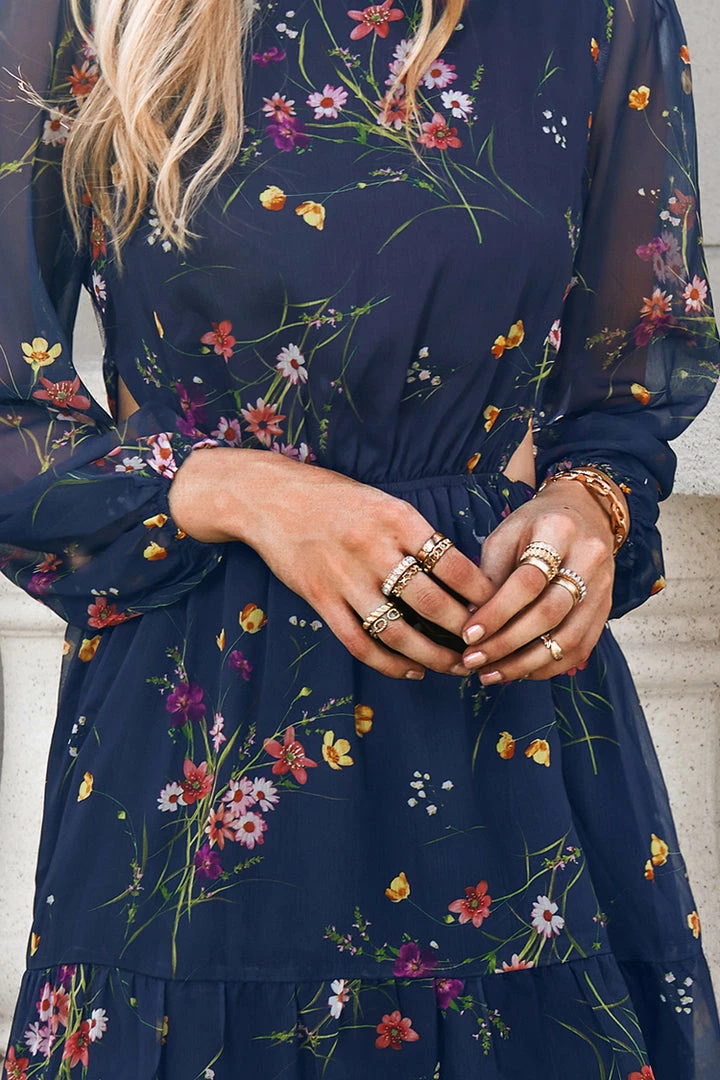 Romantic and elegant, this maxi dress is everything you need for the new season! Featuring a ditsy floral print, round neckline, cutouts, long peasant sleeves, and a ruffled hem.