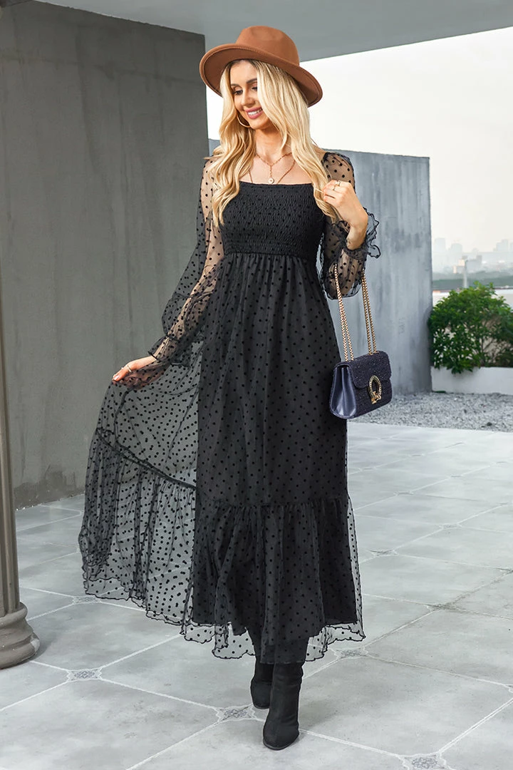 Elevate your night out wardrobe with this maxi dress! Featuring a flocked clip dot design, square neck, smocked bodice, sheer long trumpet sleeves, full lining, and a flounce hem.