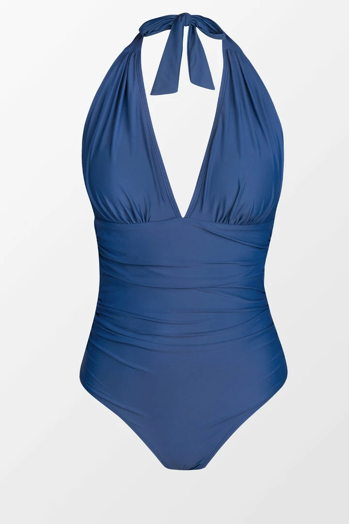 Make a splash in this one-piece swimsuit featuring a V-cut halter neckline, shirred sides for flattering effect, back self-tie closure, and classic bum coverage.ย