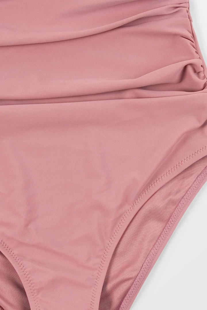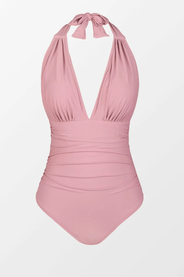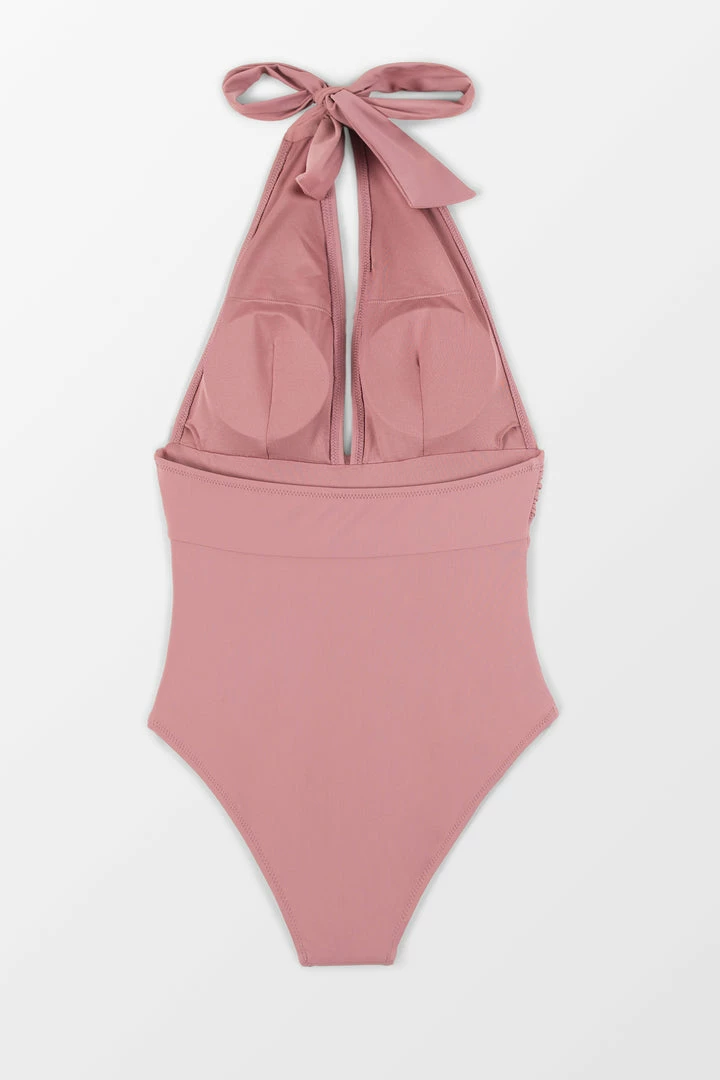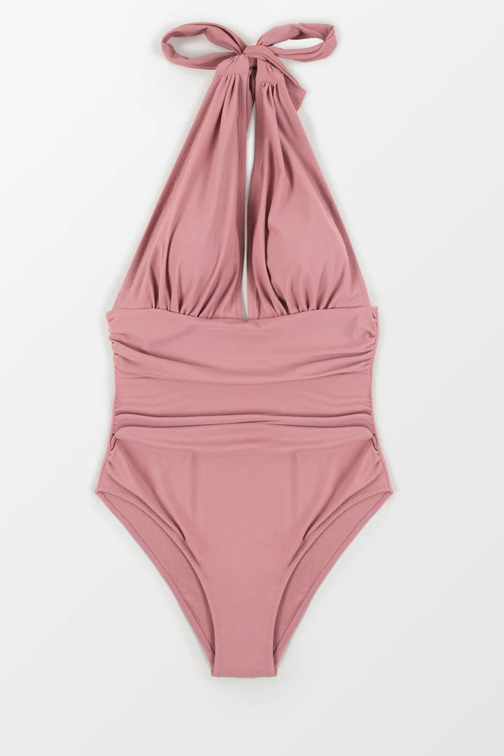 Our Bianca Dusty Pink Plunge Halter One Piece Swimsuit looks great on every body! This bathing suit features a deep v-neck, ruching at the bust and padded cups for added support.