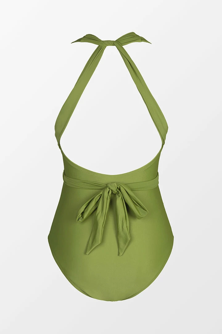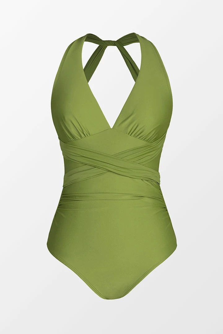 Get some vitamin sea in this one-piece swimsuit featuring a plunging neckline, side shirring creating a flattering effect, cami straps that lead to a crisscross self-tie back, and classic bum coverage.ย
