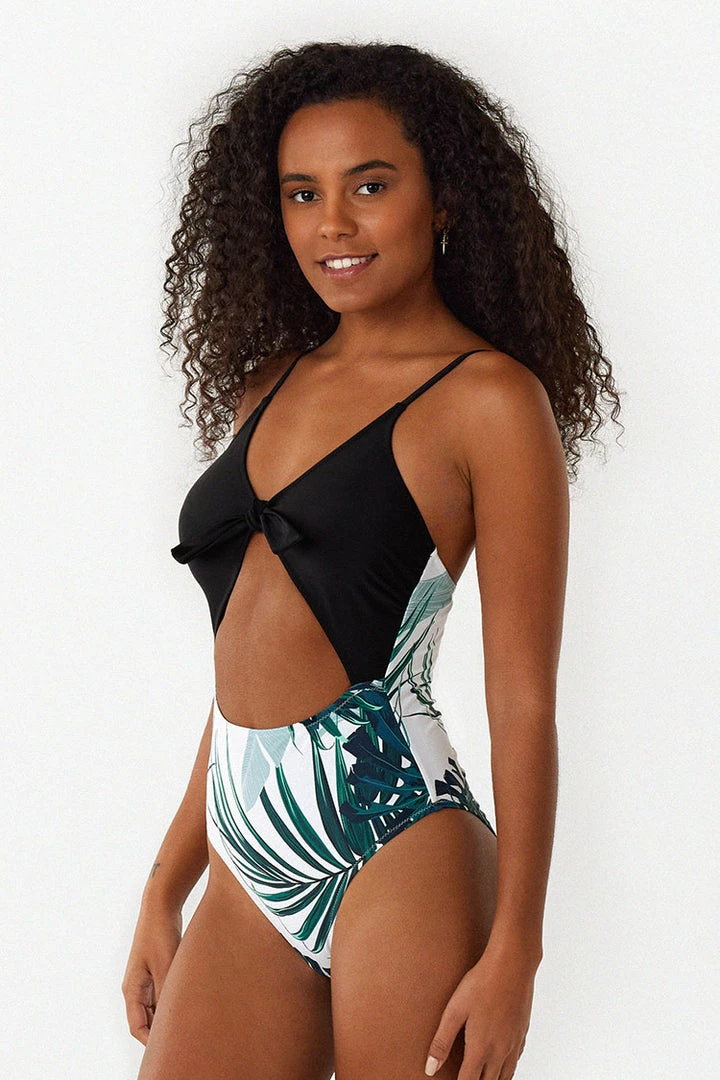 Our Gwen Tropical Cut Out One Piece Swimsuit exudes a boho and flirty vibe. Features a super cute knot detailing and cut out at front.