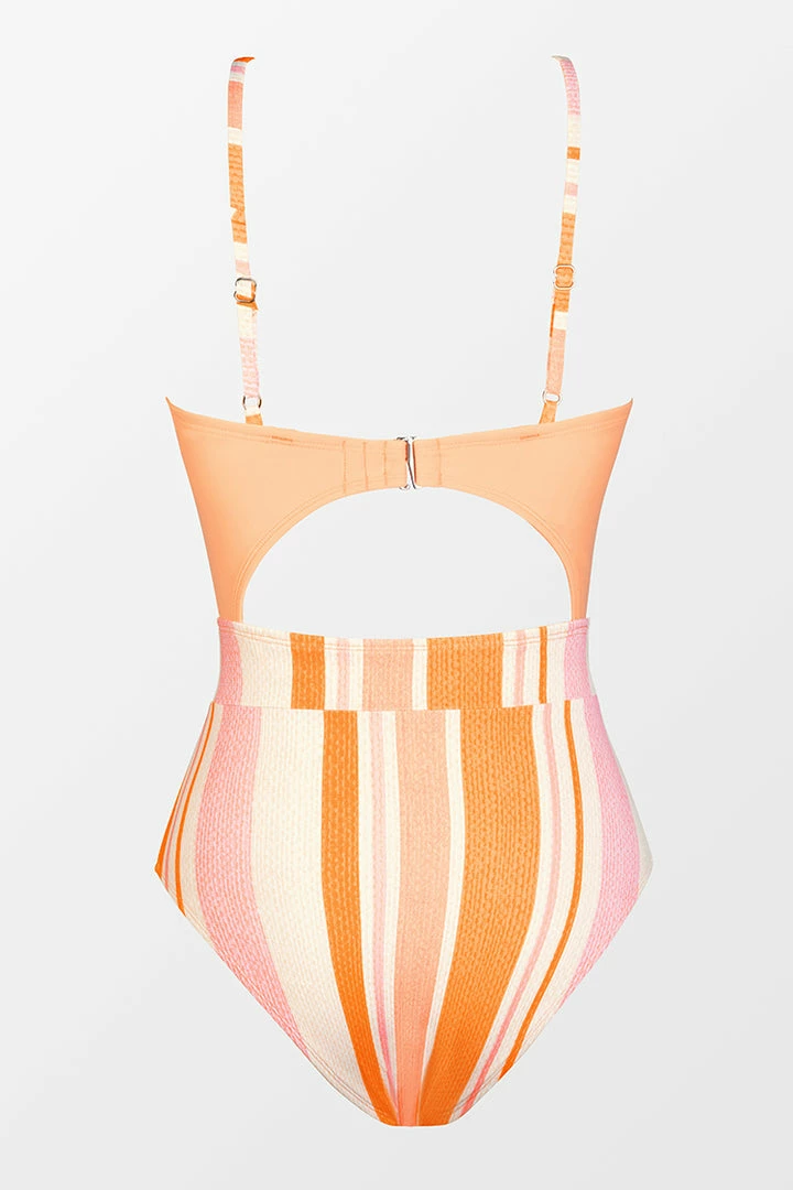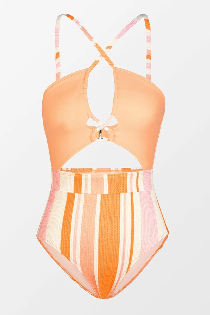 A cross neck halter, flirty cutouts, and a tunneled neckline bring extra sexy vibes to this one piece swimsuit. A solid color body and striped bottom create a fun visual that will make you the star of your next beach day.