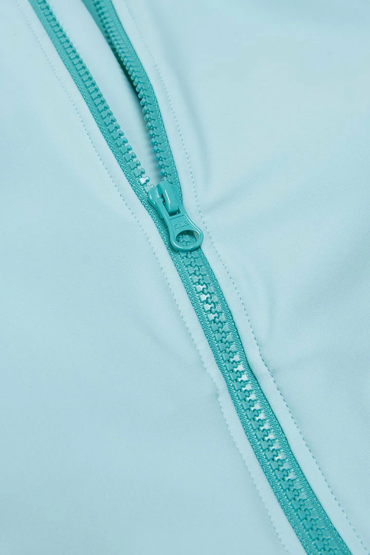 Give your vacay collection a bright update with Kaley Front Zip Long Sleeve One Piece Swimsuit. Features with high neck and front zip, light color bodice add some fun!
