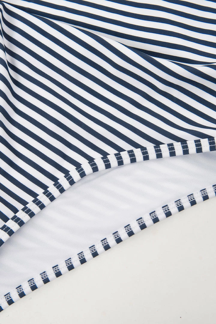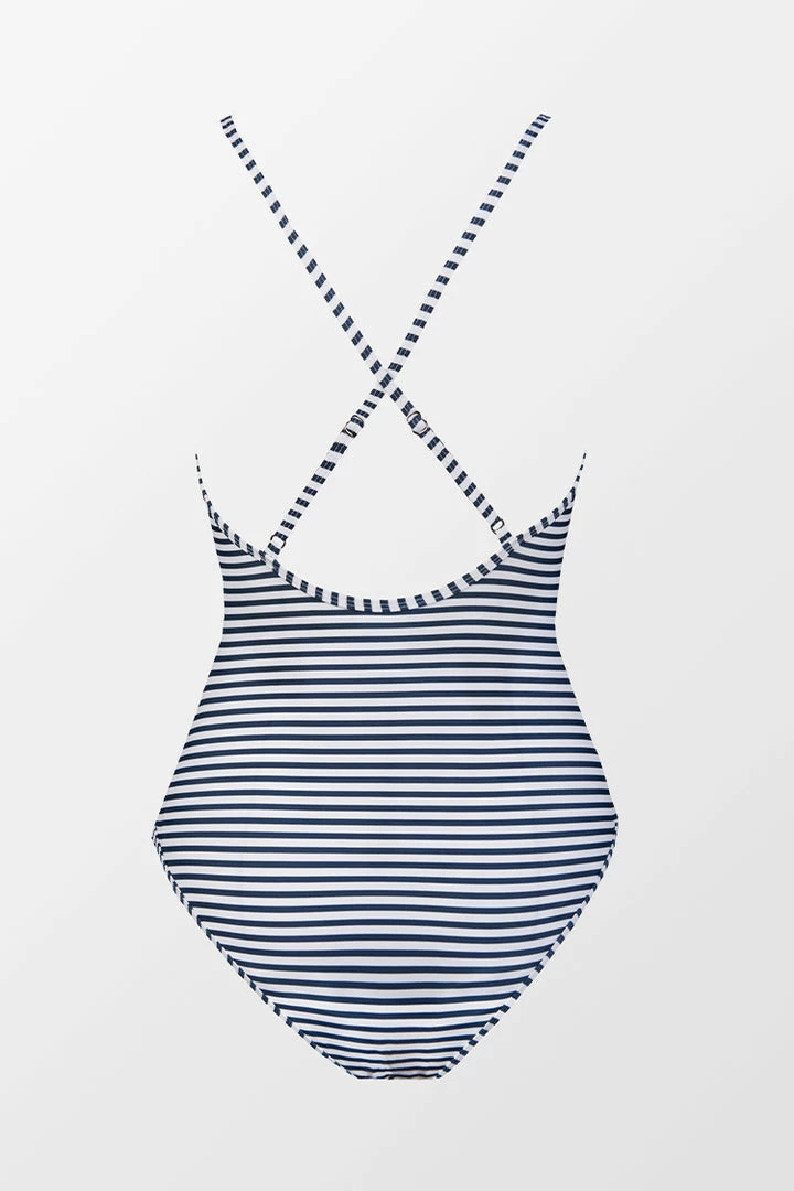 A modern take on black and white stripes. The Lasting Appeal Stripe One-Piece Swimsuit has shoulder straps that crisscross at the back.