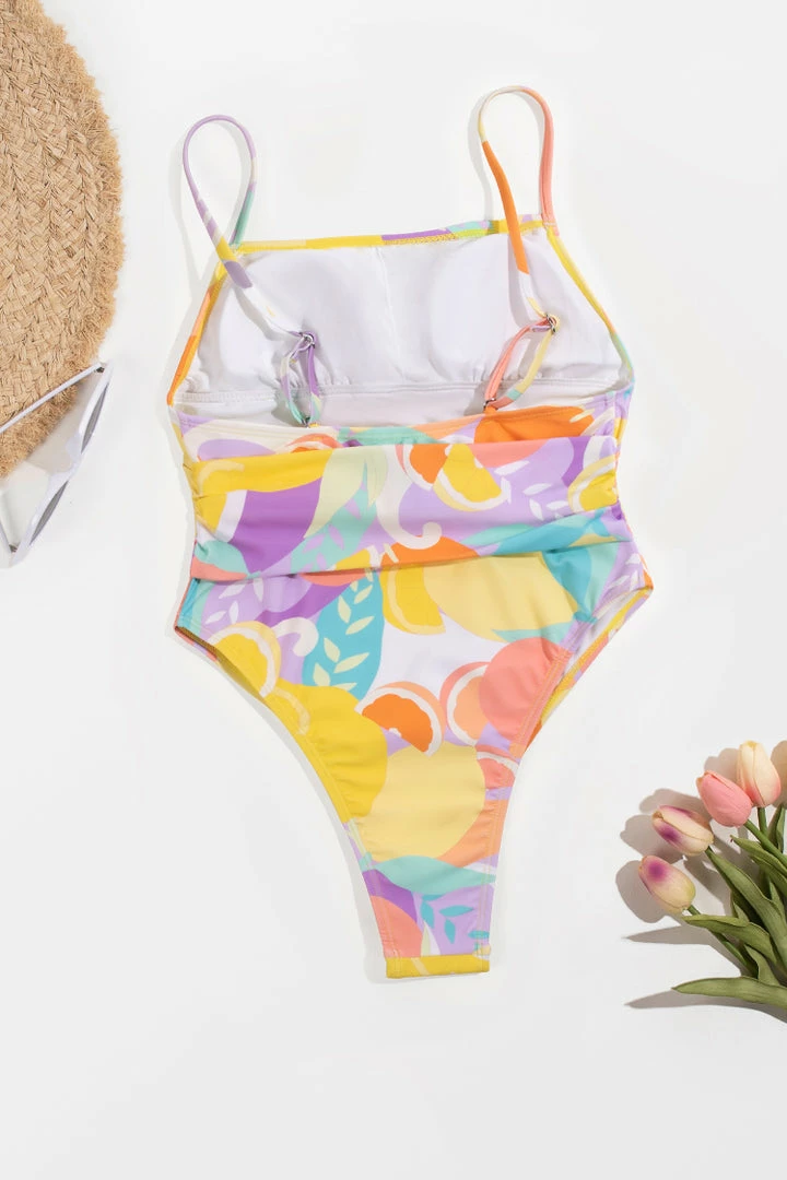 Lounge poolside in this one-piece swimsuit featuring an allover fruit print, square neck, ruched belt with O-ring buckle, adjustable cami straps, and an extra cheeky high-leg cut for a sexy edge.ย