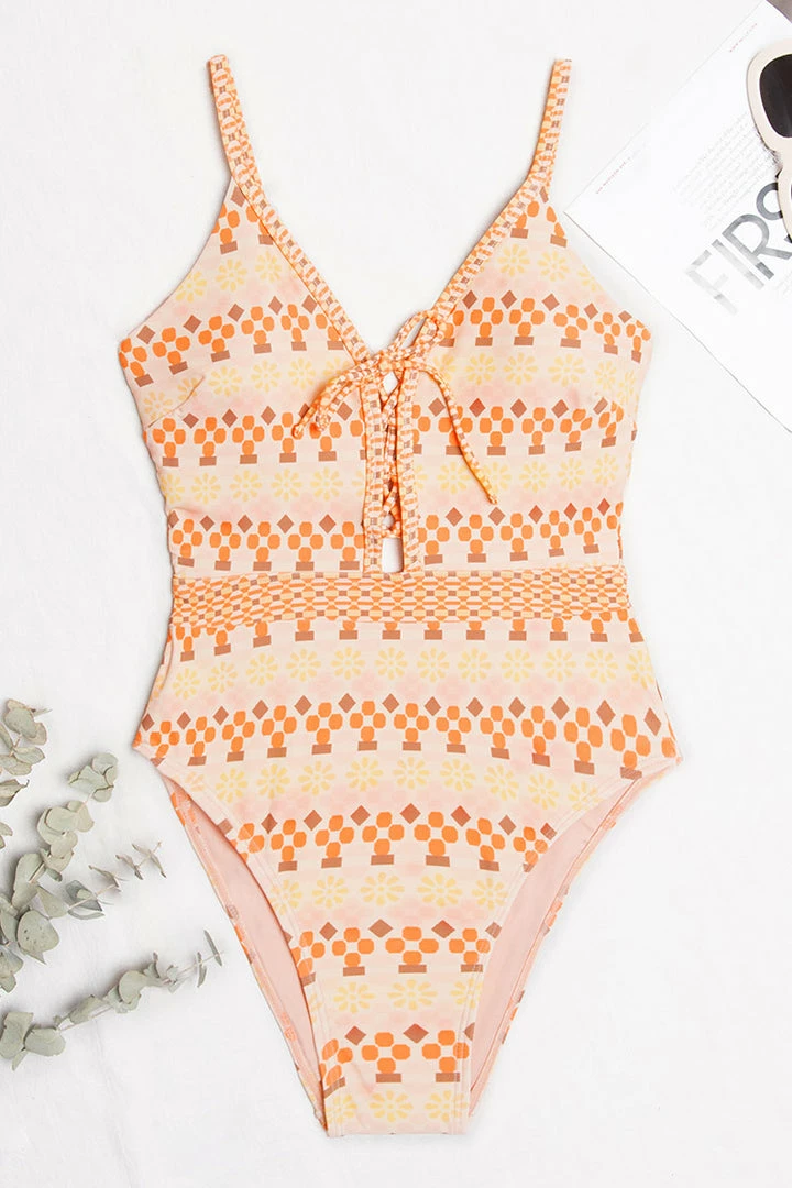 Stefanie Geo Print Lace-up One Piece Swimsuit is cute and flirty. Features geo print and lace-up front. Cut-out back detailing add more sexy vibe.