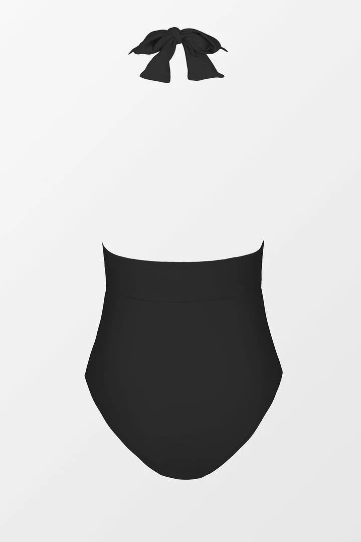 Put on this classic one piece swimsuit and dive in! Feminine ruching gives this swimsuit a flattering fit, while the plunging neckline and backless design add to the glamour of this swimsuit. Wear it with stylish flip-flops or with matching accessories.