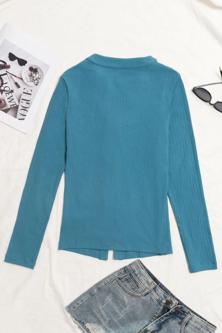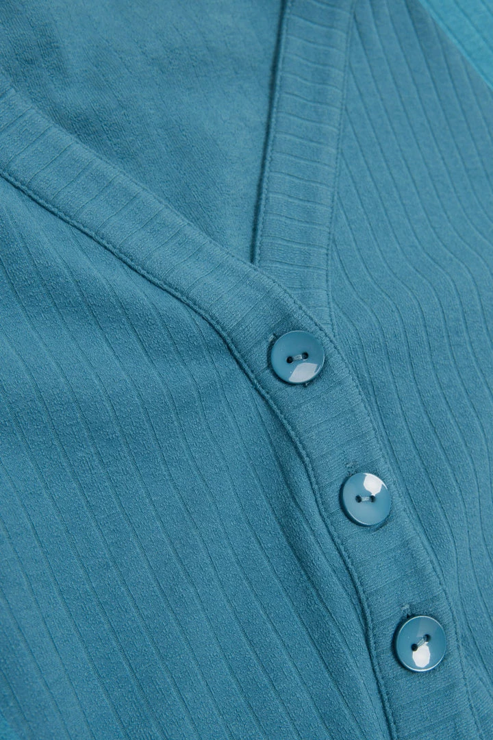Easy to pair with everything from casual sweatpants to leggings, this Palm Teal Front Open Button Cardigan is just what you need for a polished look and more with a playful v-neckline and buttoned front open detail.
