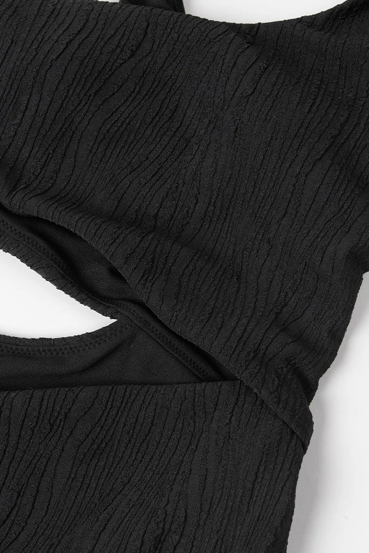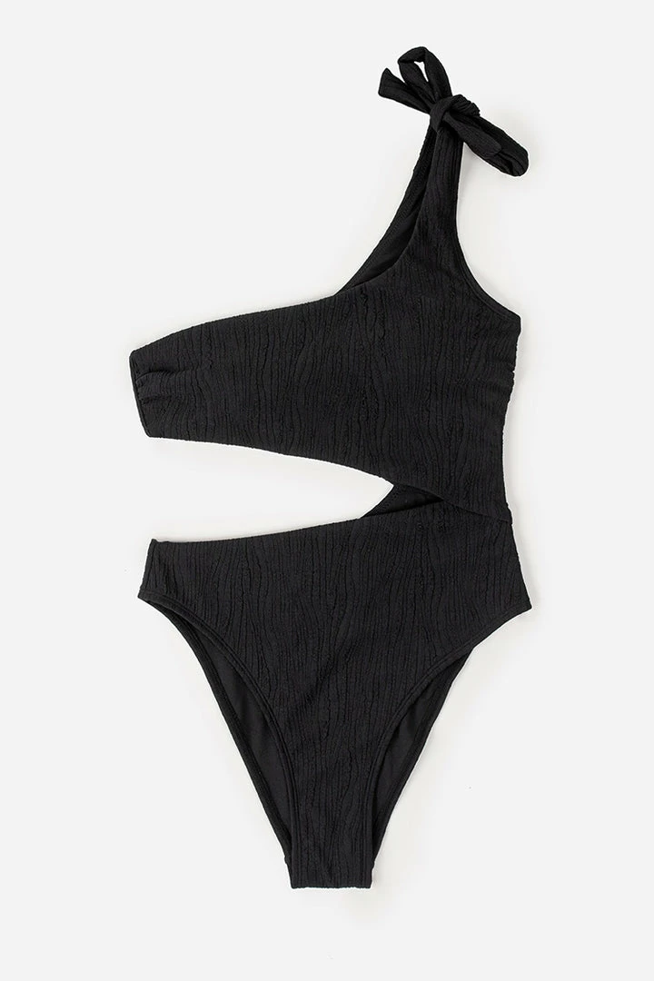 Paluma Falls Black Cut-out One Piece Swimsuit is a must-have for the vacay season. Featuring bow tie one shoulder and cut-out design. It will make you feel cute and comfy all summer long.