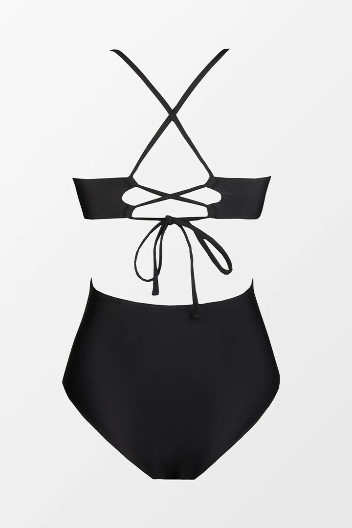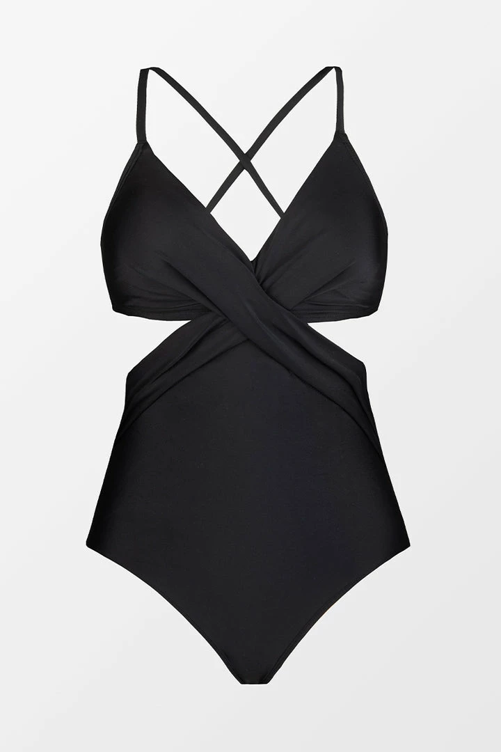 Sexy and sleek, this one-piece swimsuit features a plunging surplice neckline, cami straps that form a crisscross self-tie back, side cutouts that extend to the back, and classic bum coverage.