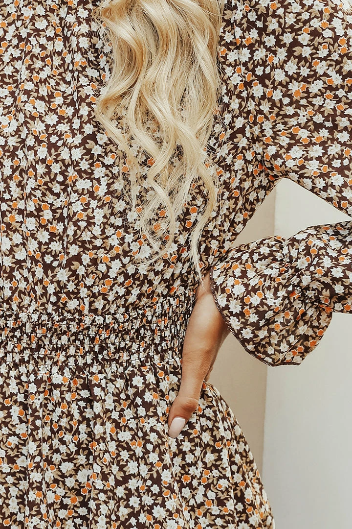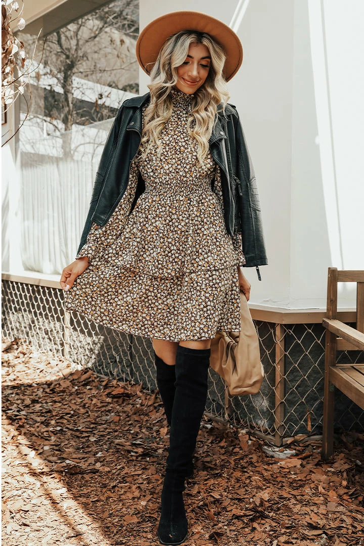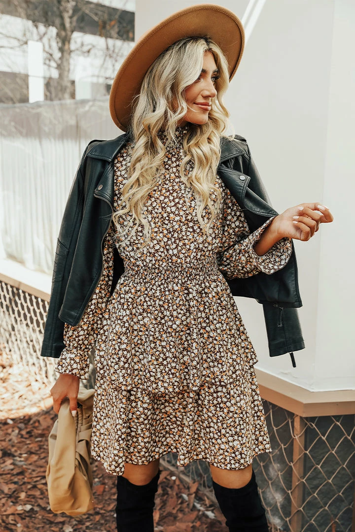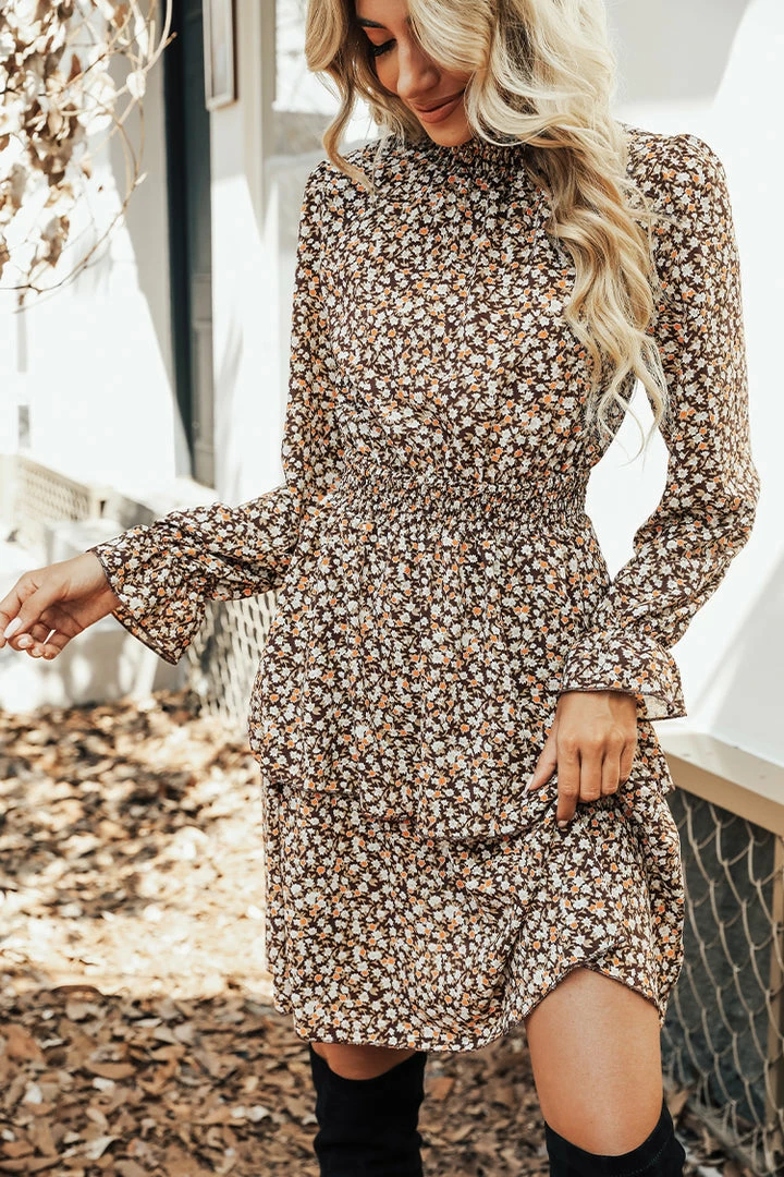 Embrace a boho vibe in this woven mini dress featuring a ditsy floral print, smocked mock neck and waist, long trumpet sleeves, a tiered hem, and ruffled trim.ย