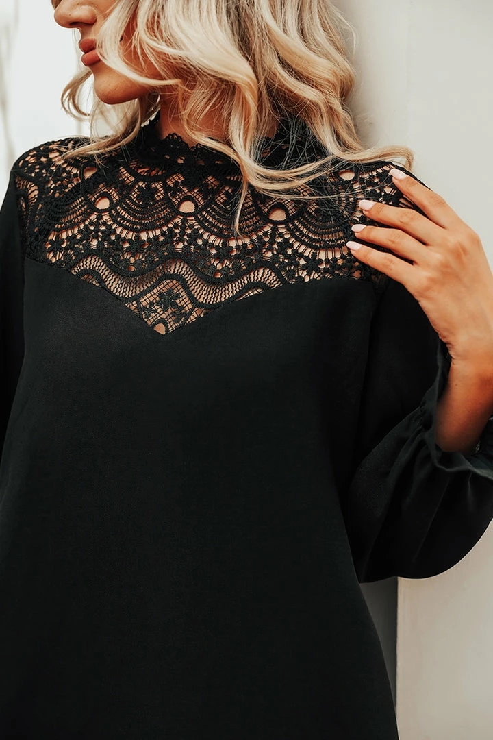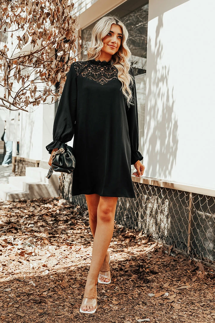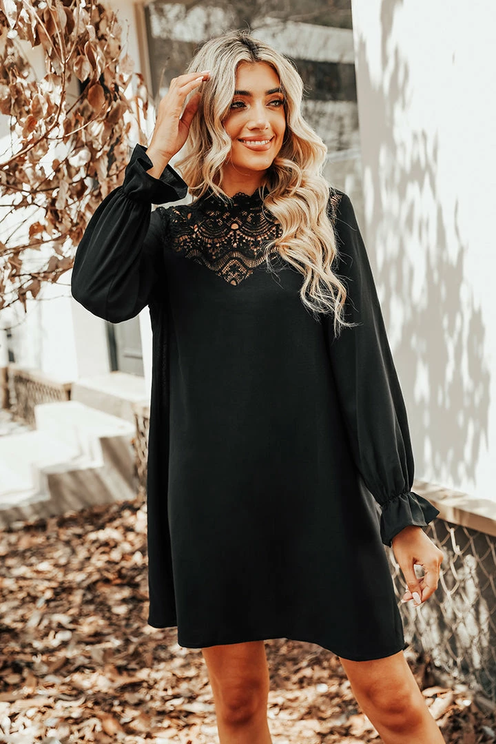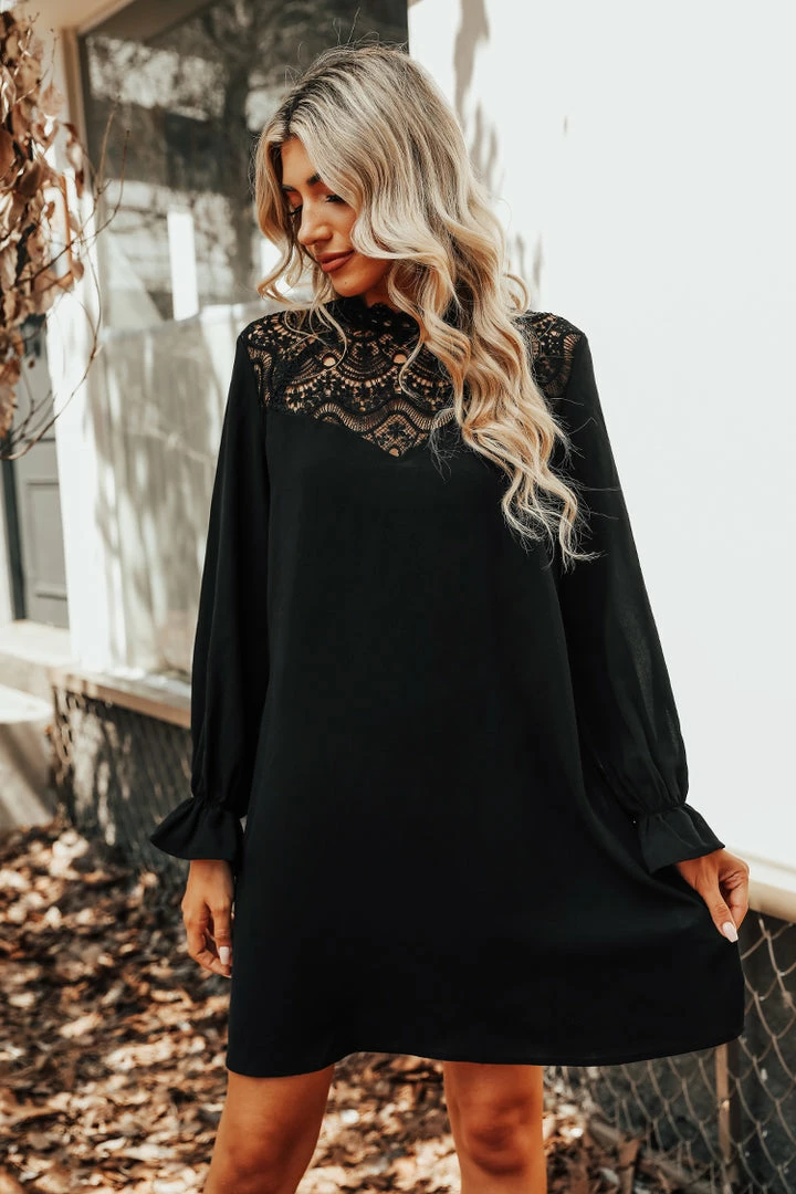 Add a touch of elegance to your closet with this midi dress featuring a lace yoke, mock neck with scalloped trim, long trumpet sleeves, and a straight silhouette.