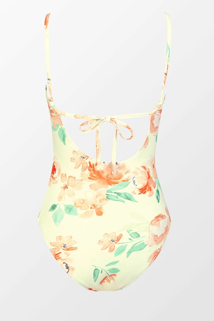 Show off your flirty side with the Relaxing Flowers Tunneled Cutout One Piece Swimsuit. The sweet swimsuit is fashioned with tunneled ties that cinch at the front and keyhole cutouts to add more sex appeal. The backless design brings more charm to the look.