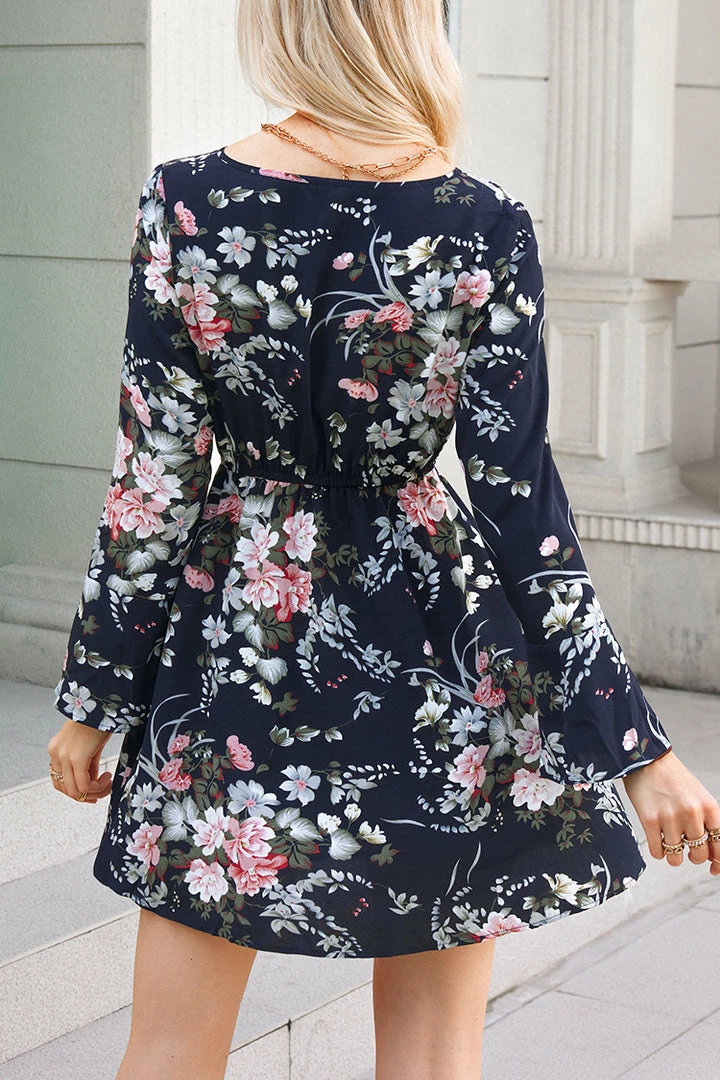 This woven mini dress is perfect to wear on your next date night! Featuring a floral print, split neck with self-tie closure, elasticized waist, long flared sleeves, and an A-line silhouette.