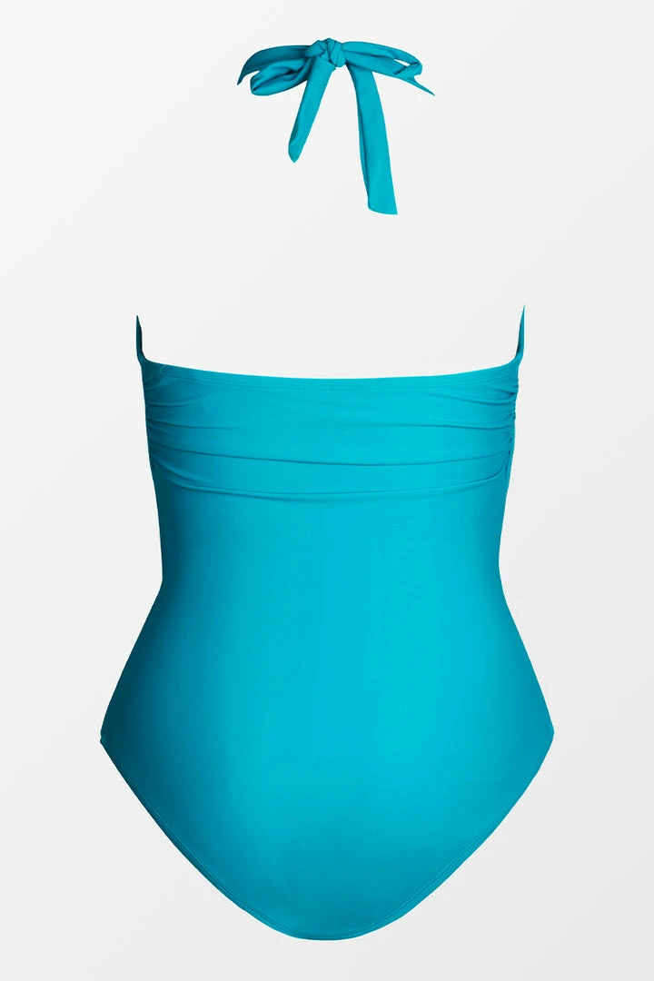 The one piece is designed with a trendy high neck silhouette and keyhole detail at the front to show your beautiful shoulder line. The shirring torso offers a flattering shape for all body shapes. The sash belt adds a sophisticated detail to finish the look.