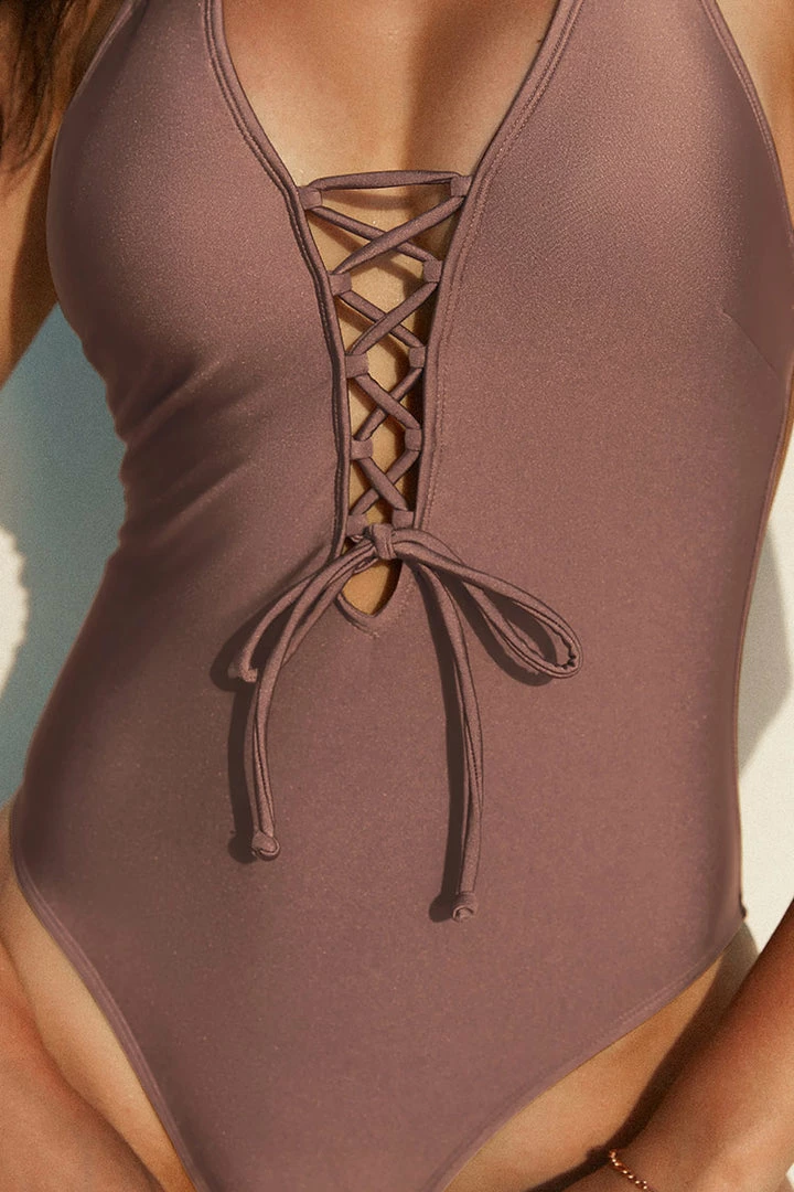 Make a splash in this Strawberry Fields Forever Back Tie One Piece. The back tie and lace up detail will add more support for you.