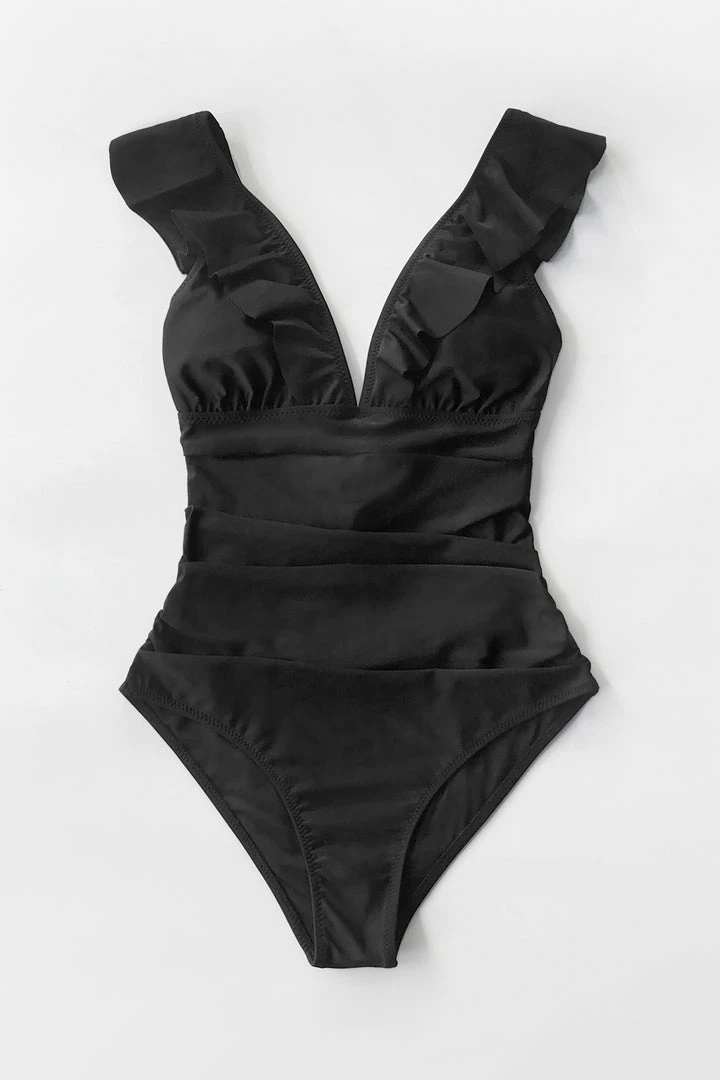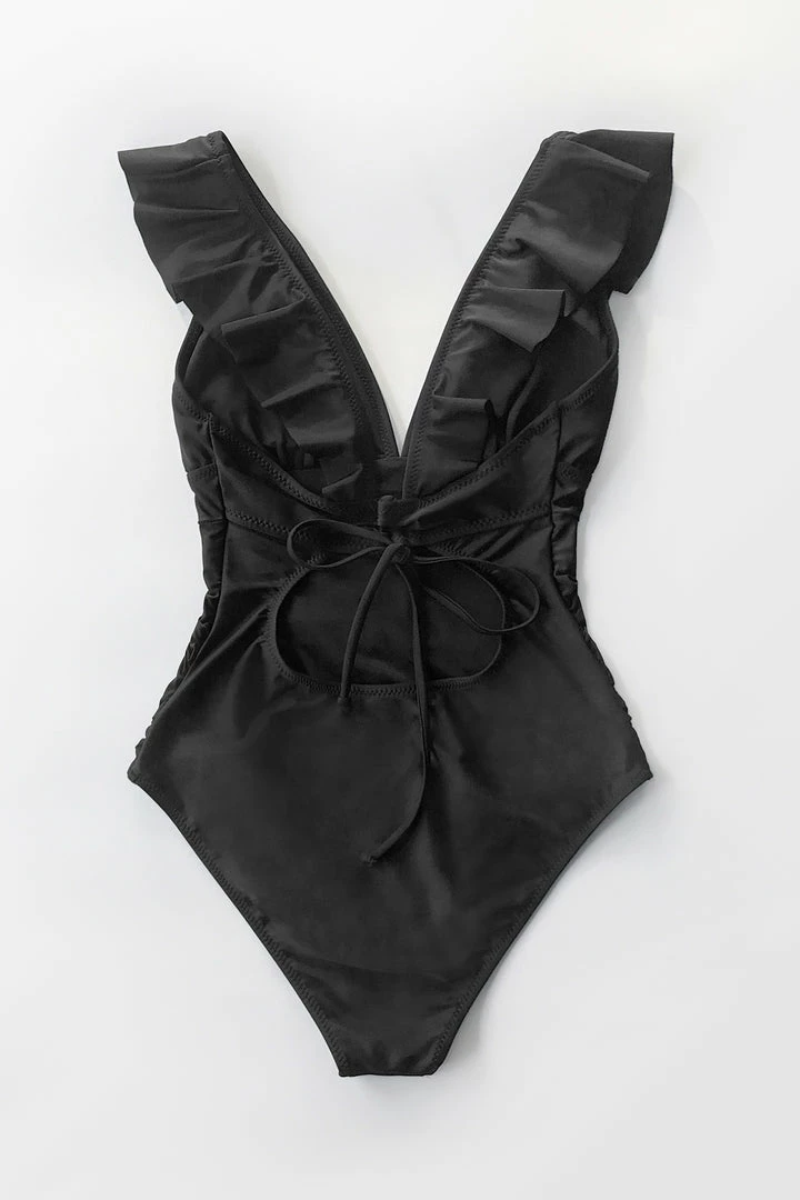 Look stunning from every angle in this one piece swimsuit. The ruffled accents highlight your feminine charm, and the lace-up back tie and back cutout give it an extra sexy kick.