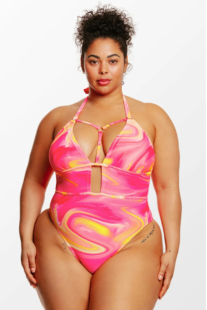 The summer just got HOTTER with this one-piece swimsuit. With its chic swirl print, strappy design, plunge neckline, and high-leg cut, youโll for sure cause the next heatwave.ย