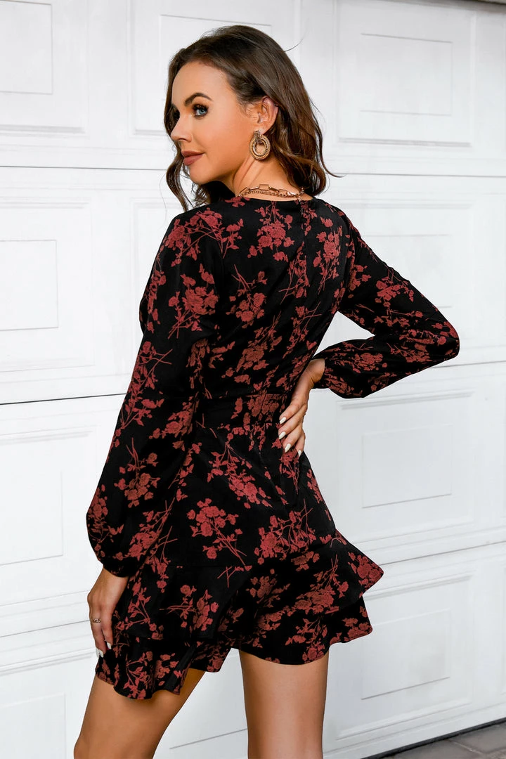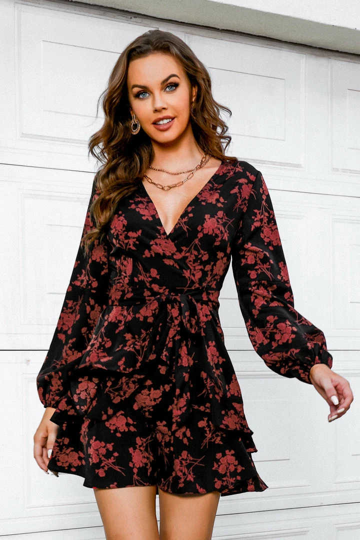 Look stunning on your next date night in this woven wrap dress featuring a floral print, surplice neckline, self-tie sash belt, long peasant sleeves, ruffled hem, and a mini hem.