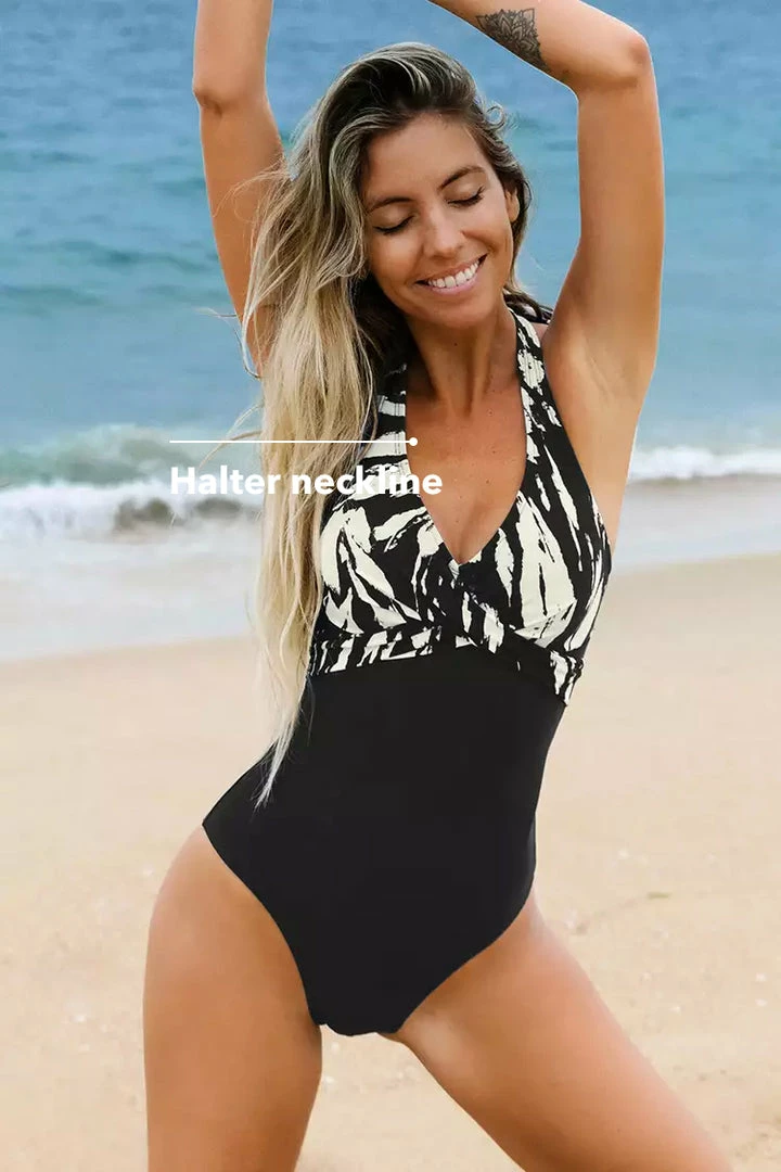 A black one-piece with a twist, literally! Featuring a partial abstract zebra print, V-cut halter neckline, twist-front bust, back self-tie closures, and classic bum coverage.
