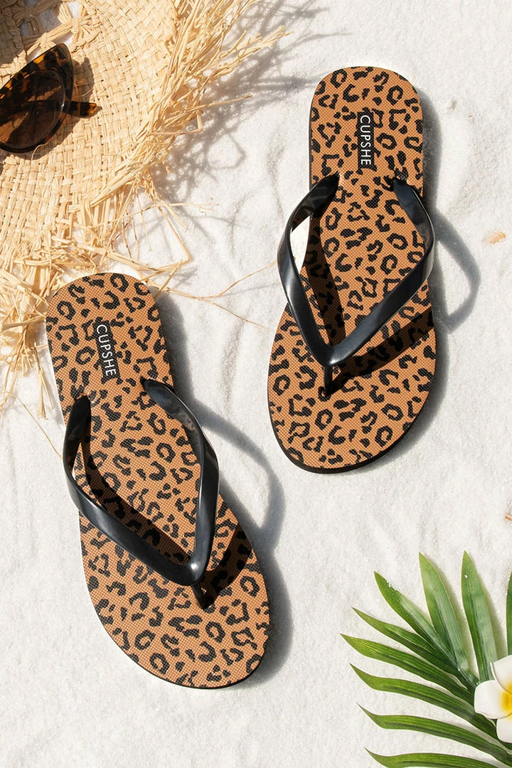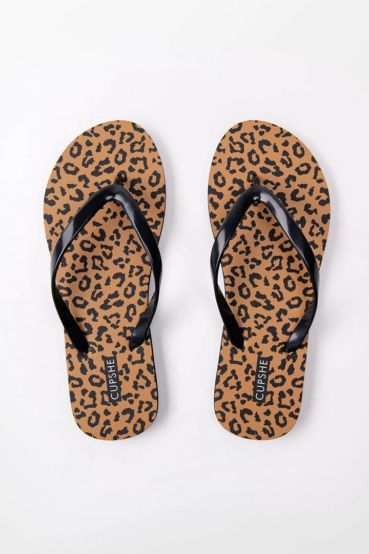 Our Wild Side Leopard Flip Flops is a classic flip-flop sandals make for a summer wardrobe staple; Easy slip-on design with open toe and strapless back; Comfy sole with no heel for easy wear; Animal Prints design meets your swimsuit and summer outfit matching needs.