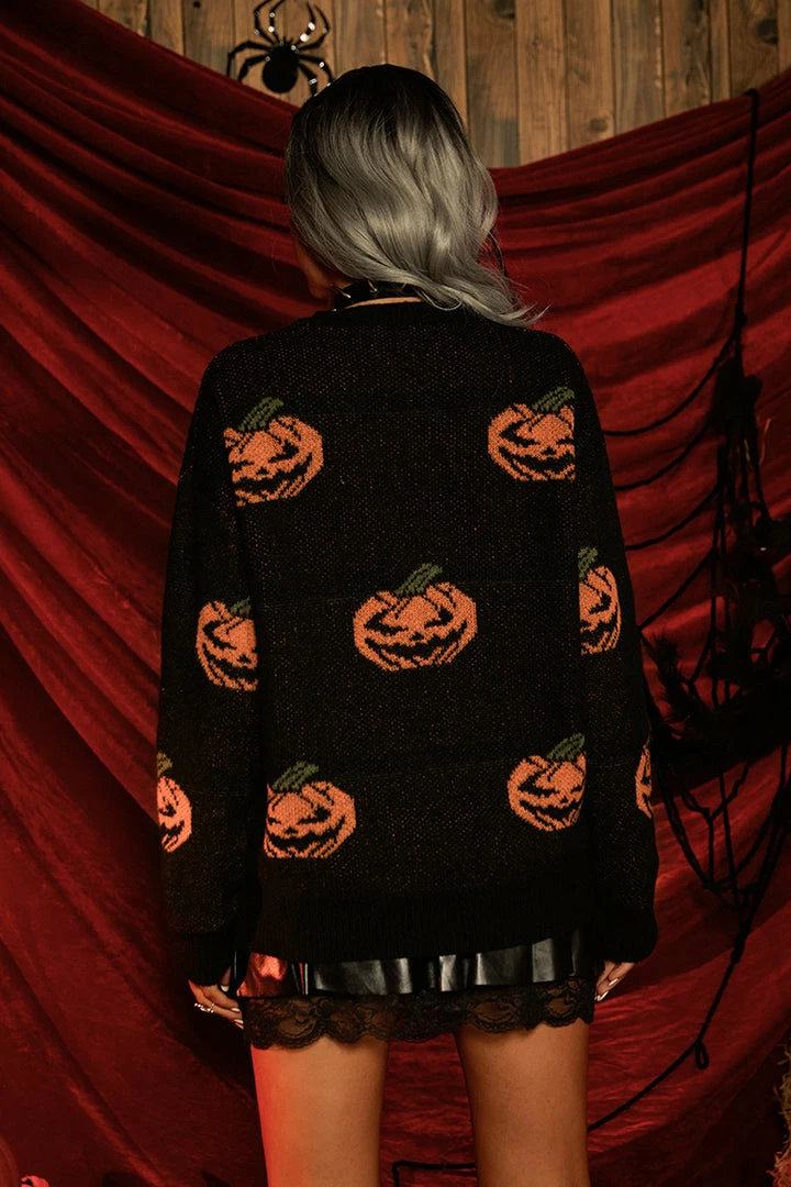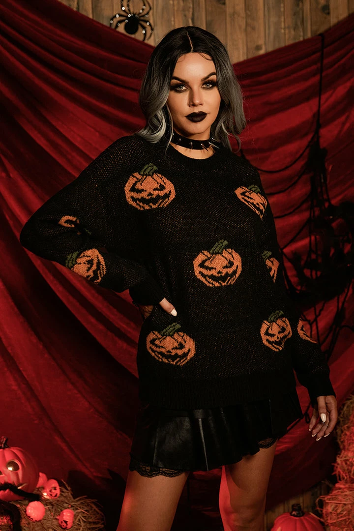 Halloween is just around the corner, time to celebrate with this Jack-O’-Lantern Oversized Sweater! Featuring a round neckline, allover pumpkin print, and dropped long sleeves.